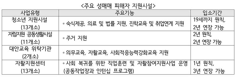 ㅇ 시설 퇴소 후에도 사회 복귀가 어려운 피해자를 위해서는 자립지원 공동생활시설로 주거 공간을 지원하고, 자활지원센터에서 직업훈련과 기술교육을 실시하고 있다.