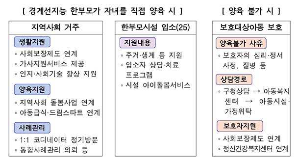 □ 사례관리위원회의 의견을 바탕으로 맞춤형 서비스를 제공한다. ▴경계선지능 한부모가 지역사회에서 직접 양육하기를 희망하는 경우 ‘한부모가족지원센터(통합지원단)’의 지원을 받을 수 있다. ▴일시적으로 주거와 생계를 필요로 하는 경우 ‘한부모가족복지시설’로 연계하며 ▴불가피하게 직접 양육이 곤란한 상황인 경우 ‘가정위탁’ 및 ‘아동복지시설’에 연계하여 자녀 양육을 지원한다.