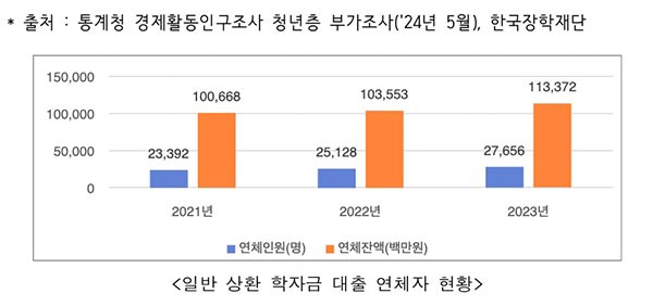 ○ 올해 5월, 통계청에 따르면 첫 취업에 평균적으로 11.5개월이 소요되고 최종학교 졸업자 중 취업하지 않은 사람은 129만 명으로 전년 동월 대비 2만9천 명 늘어난 것으로 파악됐다. 또 일반 상환 학자금대출 연체자(’23년 7월 기준)는 2만7천 명, 연체 잔액은 1,133억 원으로 ’21년부터 꾸준히 증가 추세를 보이고 있다.
