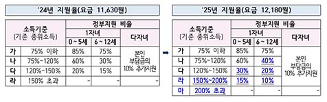 ㅇ 또한 정부지원 비율이 상대적으로 낮았던 ‘다(기준 중위소득 120~150%)’형과 초등학교 취학아동가구(6~12세 자녀)의 정부지원 비율도 상향하여 서비스 이용부담을 낮춘다.