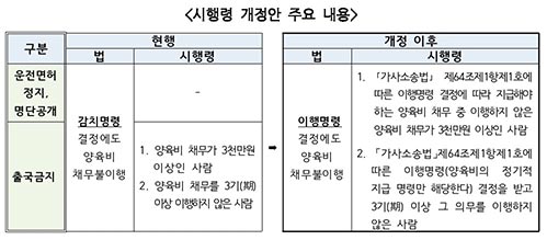 □ 시행령 개정안의 주요 내용은 간소화된 양육비 채무 불이행자 제재조치 대상자의 선정 기준을 규정한 것으로, 오는 9월 27일부터 시행된다.