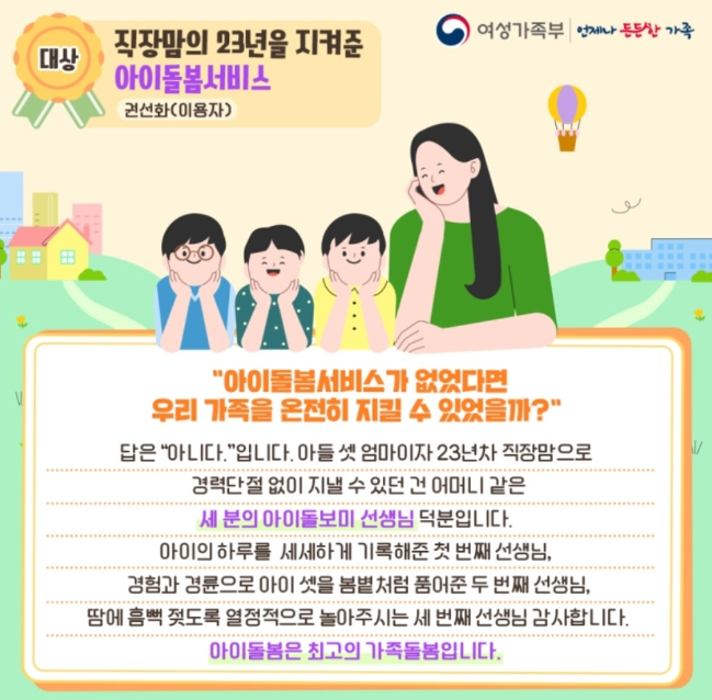 ▶2024 아이돌봄서비스 수기 공모전 아이돌보미 부문 대상.(출처 : 여성가족부 블로그)