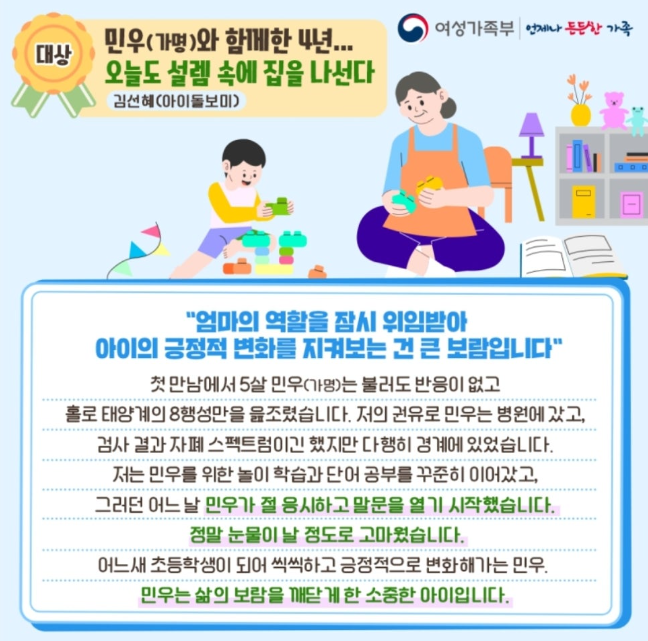 ▶2024 아이돌봄서비스 수기공모전 이용자 부문 대상. (출처 : 여성가족부 블로그)