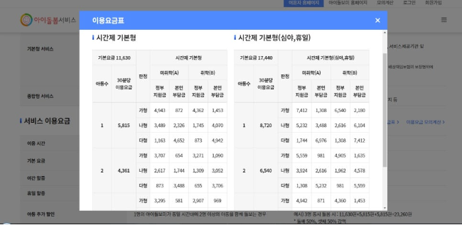 ▶아이돌봄서비스 시간제 유형별 이용요금표. (출처 : 아이돌봄서비스 누리집)