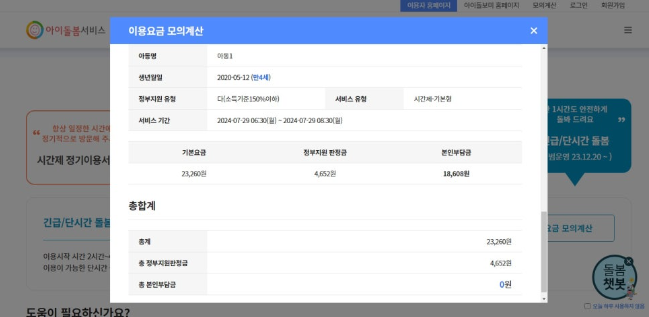 ▶아이돌봄서비스는 정부지원 유형에 따라 이용요금 모의계산도 가능하다.