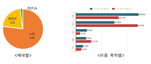 □ 이용객 중 48.6%는 진료 동행을 위해 서비스를 신청했다. 이어 투석 29.8%, 검사 8.4%였다. 월 1회이상 이용하는 시민으로 한정하면 투석 47.9%, 재활 11.7%였다.
