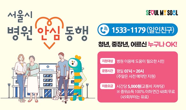 □ 병원안심동행서비스는 1대 1로 매칭된 동행매니저가 병원으로의 출발부터 귀가할 때까지의 전 과정을 함께하며 진료를 돕는 서비스다. 병원 이동은 물론 진료 접수, 수납, 약국까지 동행한다. 이 서비스는 1인가구뿐만 아니라 노인가구, 조손가정 등 가족구성원의 도움을 받기 힘든 서울시민 누구나 이용이 가능하다.