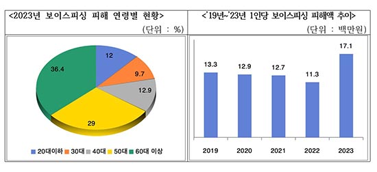 ○ 금융감독원 2023년 보이스피싱 피해현황 분석에 따르면, 2023년 보이스피싱 피해액 1,931억 원 중 60대 이상 704억 원(36.4%), 50대 560억 원(29%), 40대 249억 원(12.9%), 20대 이하 231억 원(12%), 30대 188억 원(9.7%) 순으로 50대 이상이 65.4%를 차지했으며, 1인당 피해액도 1,710만 원으로 전년 1,130만 원과 비교하면 51% 증가한 것으로 나타났다.