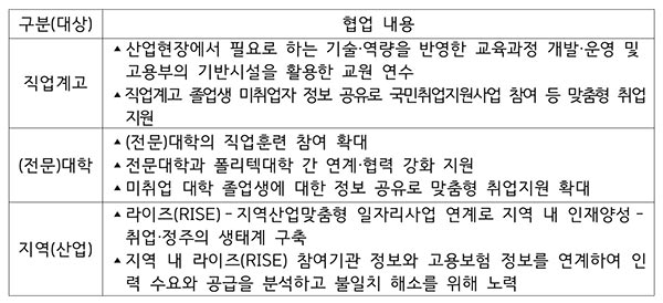 김문수 고용노동부 장관은 “청년들은 원하는 일자리를 찾지 못하고 있고, 기업은 필요한 사람을 찾는 데 어려움을 겪고 있다.”라고 말하며, “교육부와 고용노동부는 이번 협업을 통해 직업교육·훈련과 고용서비스를 연계하여 청년들은 원하는 일자리로 취업하고, 기업은 필요한 인재를 채용할 수 있도록 적극적인 맞춤형 취업지원 정책을 강화하겠다.”라고 강한 지원 의지를 밝혔다.