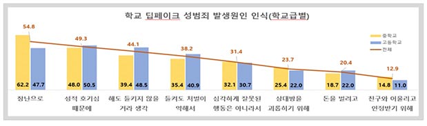 학교에서 딥페이크 성범죄가 발생하는 원인(중복응답)으로는 54.8%의 응답자가 ‘장난으로’를 1순위로 꼽았다(중학생 62.2%). ‘성적 호기심 때문에’ 49.3%, ‘해도 들키지 않을 것이라고 생각해서’ 44.1%, ‘들켜도 처벌이 약해서’ 38.2%, ‘심각하게 잘못된 행동은 아니라고 생각해서’ 31.4%의 응답을 보였다.