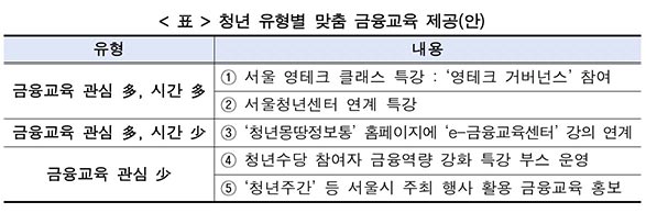 □ 이번 협약은 서울 청년의 재무 관리* 역량을 강화하고 청년에 대한 금융사기**를 예방해야 한다는 양 기관의 인식이 합치되어 이루어졌다. 양 기관은 유형별 맞춤형 접근을 통해 청년 금융교육 협력을 진행할 계획이다.
