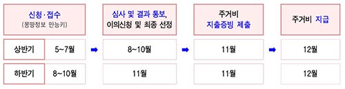 □ 상반기(5~7월) 접수자는 8월부터 자격 검증을 거쳐 10월에 결과를 발표하며, 하반기(8~10월) 접수자는 11월에 자격 검증을 거쳐 결과를 발표한다. 결과 발표 이후에는 주거비 증빙을 제출해야 하며, 확인이 완료된 대상자에게는 12월 중 주거비를 지급한다.