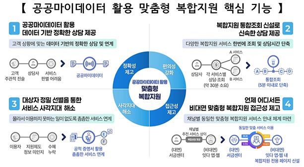 금융위원회와 행정안전부는 부처 간 협업을 통해 ’25.8.11일부터 ‘공공마이데이터 활용 맞춤형 복합지원’을 본격 시행한다. 고객의 공공정보 21종을 분석해 고용·복지 등 다양한 분야의 지원 정책을 개별 상황에 맞게끔 연계 함으로써, 연계 정확도 향상, 상담 시간 단축, 지원 사각지대 해소와 표준화된 서비스 제공이 가능해질 것으로 기대된다.