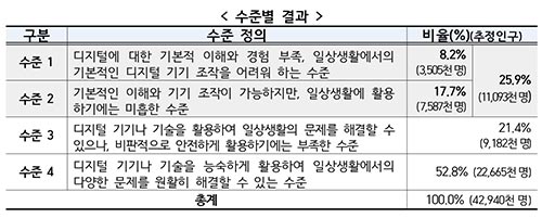 디지털에 대한 기본적 이해·경험이 부족하며 일상생활에서의 기본적인 디지털 기기 조작에 어려움을 겪는 ‘수준 1’ 성인은 전체의 8.2%(약 350만 명)로 나타났으며, 기본적인 이해와 기기 조작이 가능하지만 일상생활에 활용하기에는 미흡한 ‘수준 2’ 성인은 전체의 17.7%(약 758만 명)로 나타났다.