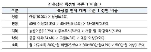 전체 대비 ‘수준 1’ 인구 비율은 남성보다는 여성에서, 연령이 높을수록, 도시보다는 농산어촌에서, 학력이나 소득이 낮을수록 상대적으로 높은 것으로 나타났다.