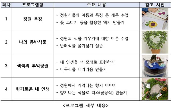 - 정원 특강, 반려 식물 심기, 테라리움 제작 등 정서·치유·여가 결합형 오감 체험 수업