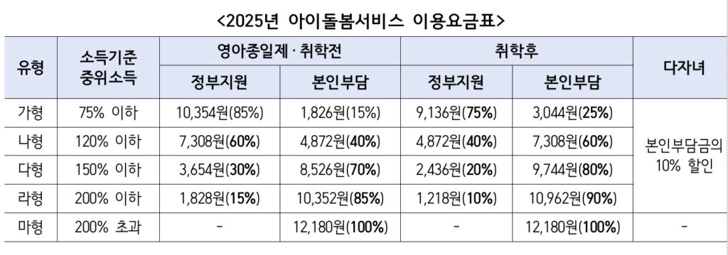 ※ 아이돌봄서비스 이용요금(시간당 12,180원/평일기준), 소득구간(가~라형)에 따라 최대 85% 정부지원