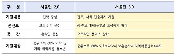 □ ‘서울런 3.0’은 입시 강좌는 물론 진로탐색, 예체능, 이공계 인재 양성 등 콘텐츠를 다양화하고 시대 변화를 반영한 ‘AI 진로 진학 코치’ 시스템을 도입한다. 또 온라인을 넘어 서울 시내 대학교와 취업지원기관 등에도 강좌를 신설해 학습기반 강화에도 힘쓴다.
