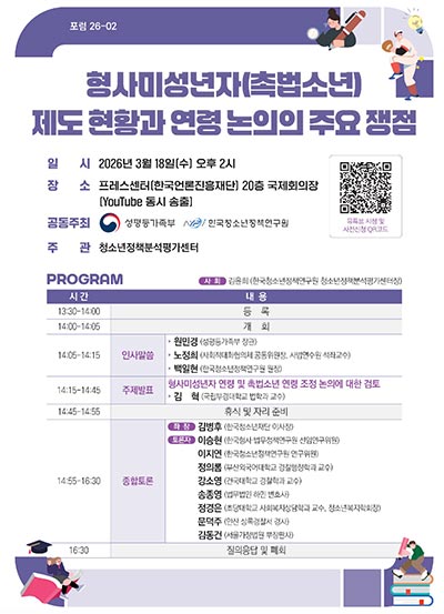 □ 성평등가족부(장관 원민경)는 3월 18일(수) 한국청소년정책연구원(원장 백일현)과 공동으로 프레스센터(한국언론진흥재단)에서 「촉법소년 제도 현황과 연령 논의의 주요 쟁점」을 주제로 포럼을 개최한다.