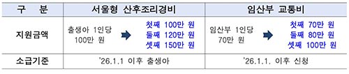 • ‘산후조리경비’ 출생아 100만 원/인→ 둘째 120만원․셋째 150만 원, ‘임산부 교통비’도 차등