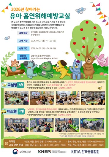 보건복지부(장관 정은경)와 한국건강증진개발원(원장 김헌주, 이하 개발원)은 4월 7일(화)부터 14일(화)까지 금연두드림 누리집(nosmk.khepi.or.kr/nsk)을 통해 어린이집과 유치원의 ‘2026년 찾아가는 유아 흡연위해예방교실’ 참여 신청을 받는다고 밝혔다.