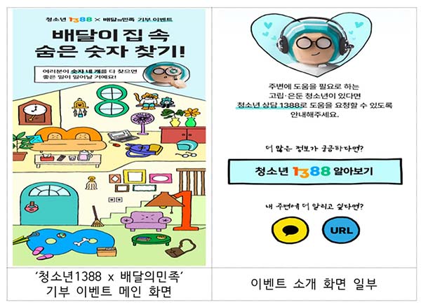 □ 배달의민족은 20일(월)부터 고립·은둔 청소년과 가족들이 정부 지원 서비스를 신청할 수 있도록 앱 첫 화면에서 ‘청소년상담1388’을 홍보하고, 이용자들의 참여를 통한 기부 이벤트를 진행한다.